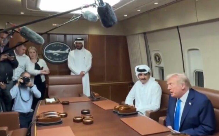 Air Force One uçağının Katar’daki El Udeid Hava Üssü’nde yakıt ikmali yaptığı sırada gerçekleşen görüşmede Trump, Katar’ı “harika bir müttefik” olarak nitelendirdi.